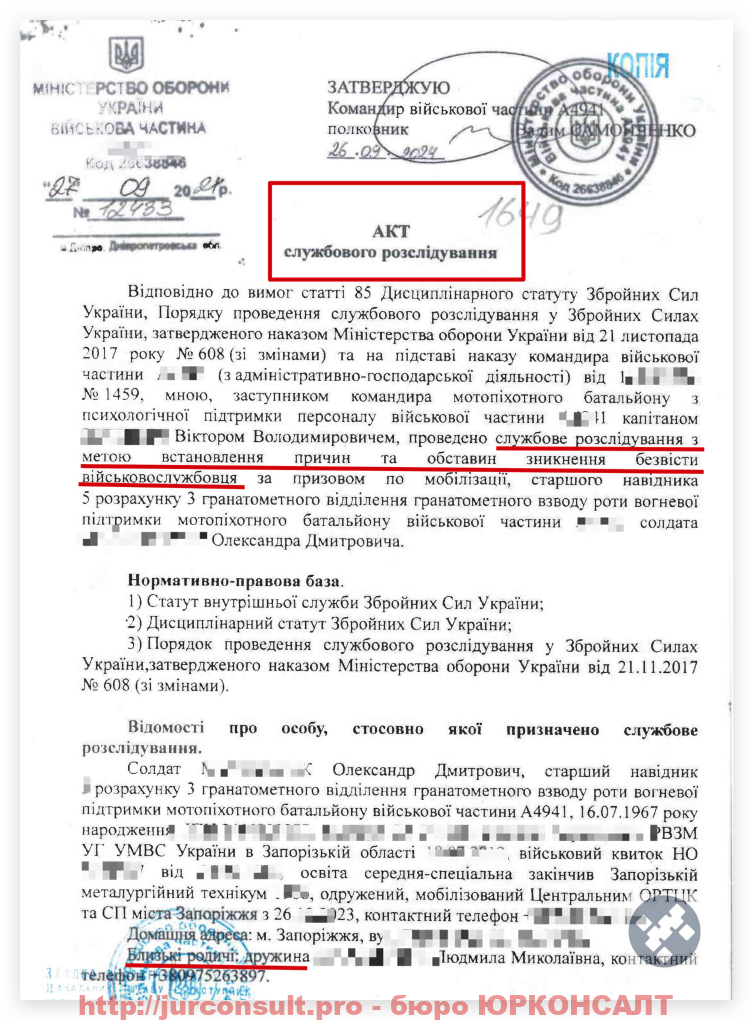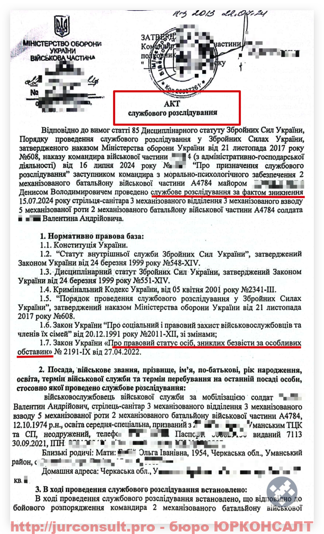 Одним з основних документів для отримання членами сім’ї зниклого безвісти військового відповідного статусу – є Акт службового розслідування: