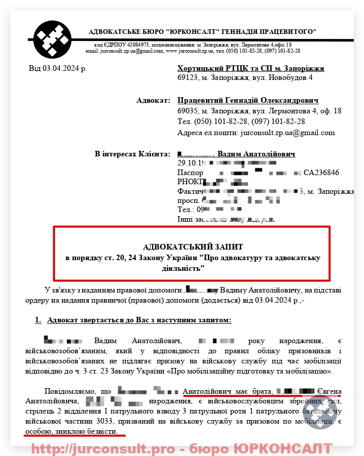 Для захисту наших клієнтів ми як правило, використовуємо адвокатські запити, скарги, та вихід адвокатів до органів ТЦК: