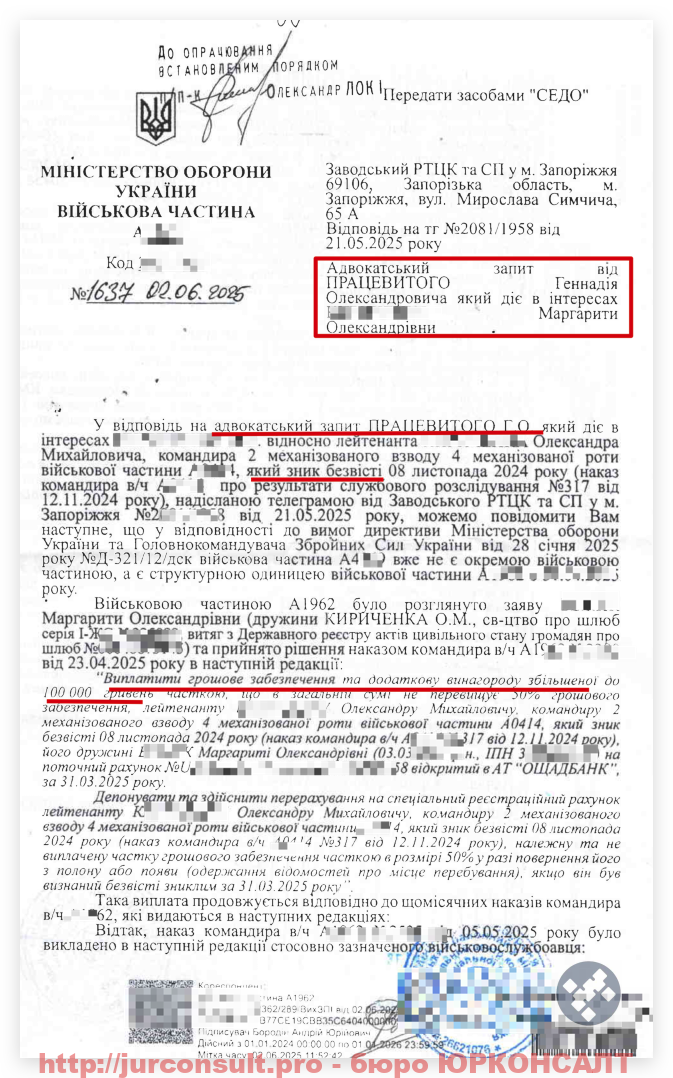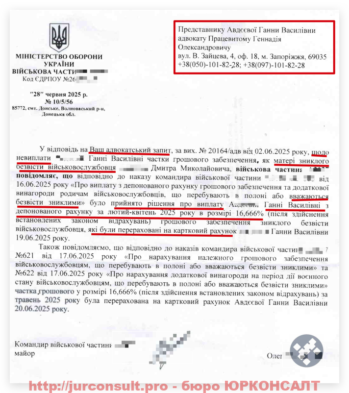 Наші військові юристи вже допомогли десяткам сімей військовослужбовців що зникли безвісти – отримати необхідні документи від військової частини, що передбачені Законодавством.