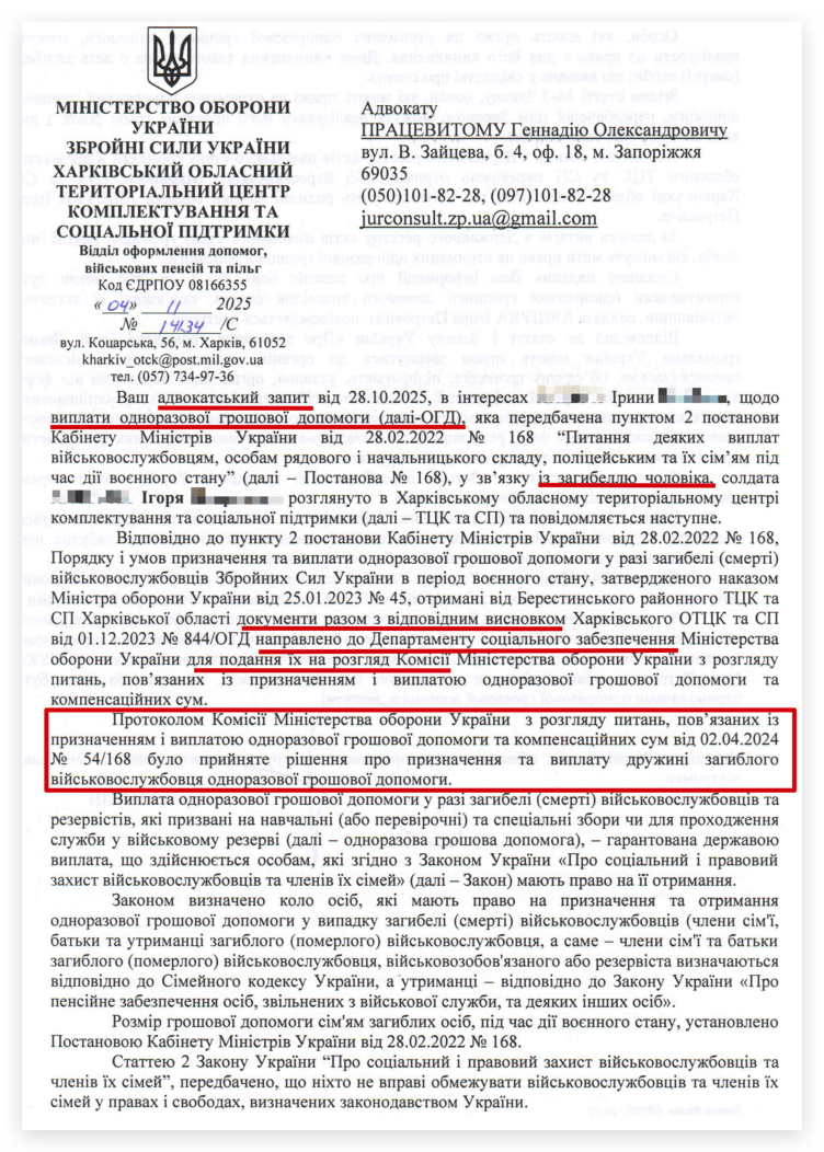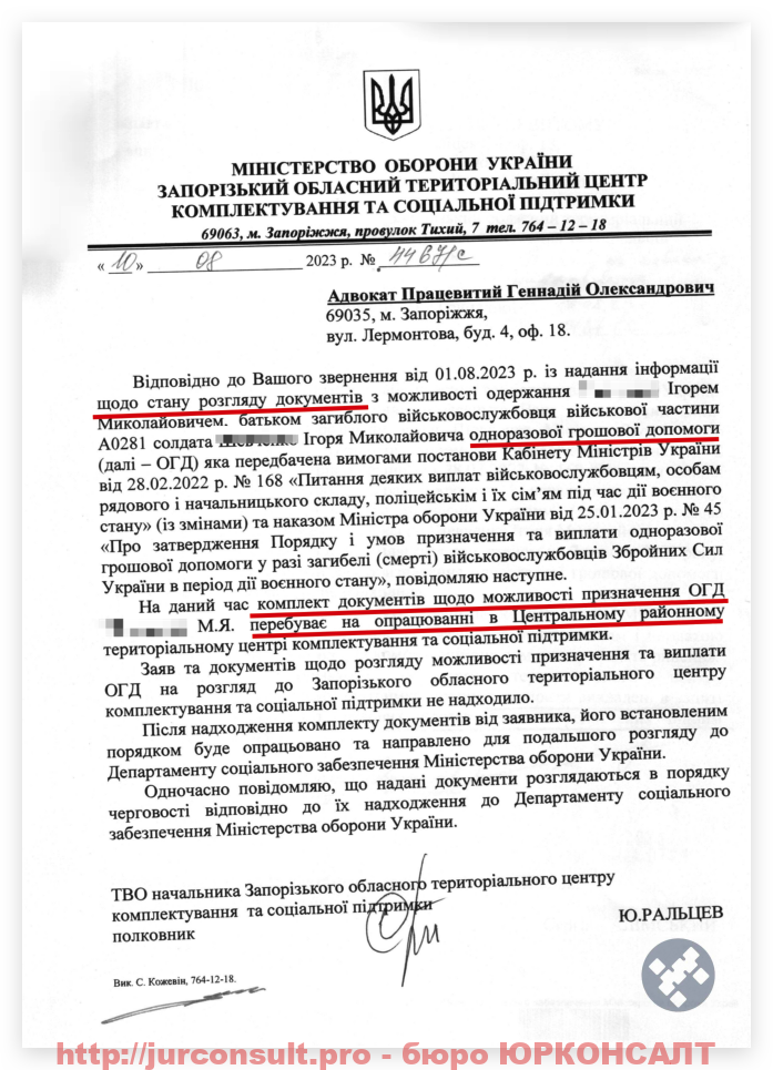 По цьому клієнту ТЦК не хотіло займатися документами на ОГД на повнолітнього сина військового. Хоча закон на момент смерті – прямо це передбачав.
