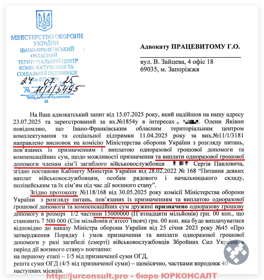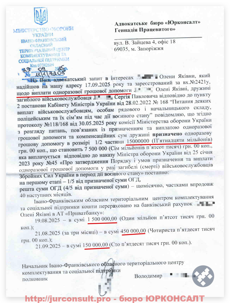 Окрім основної виплати в 15 000 000 грн. ми також допомагаємо отримані і інші визначені законом пільги та надбавки: допомагаємо з пенсіями по втраті годувальника, виплати від частини, виплати на поховання, тощо.