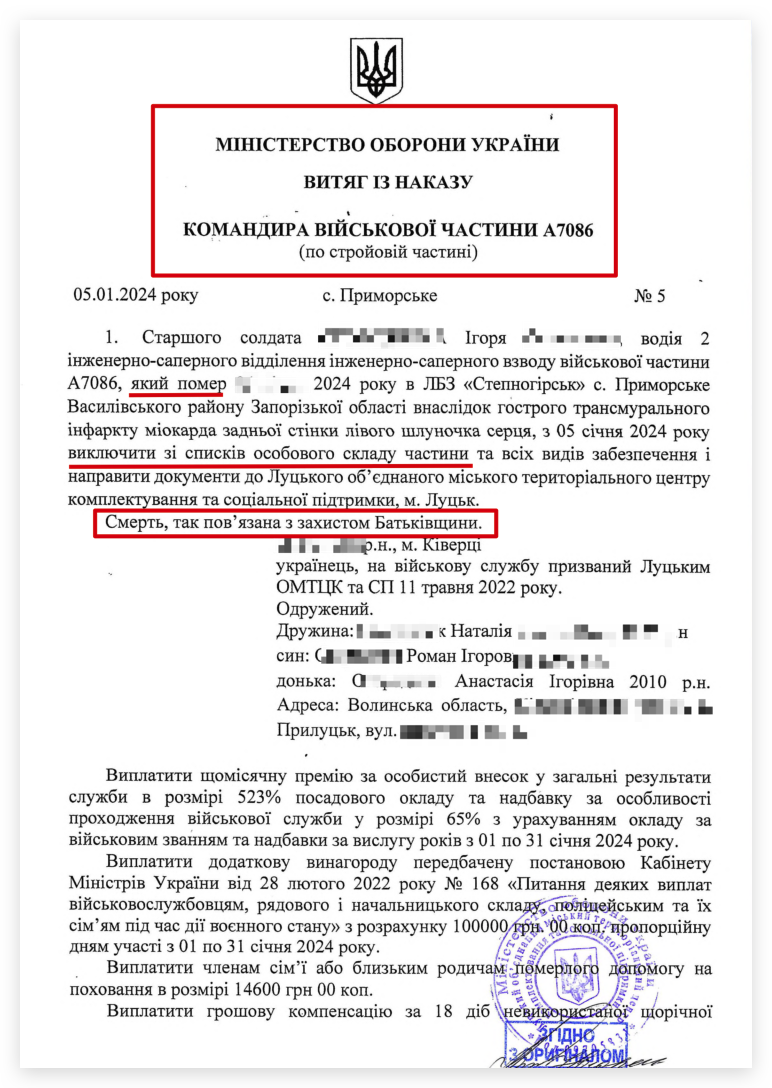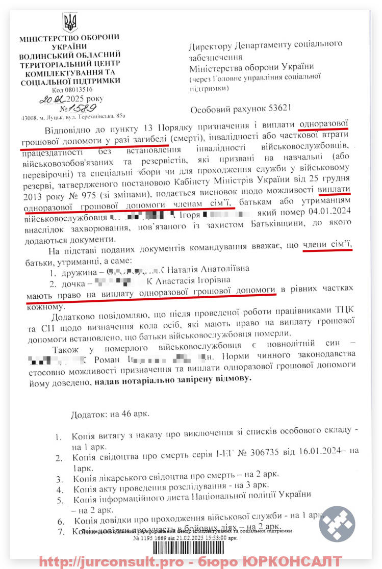 Вказаний документ автоматично повинні отримувати ТЦК від військових частин. В теорії рідні загиблого не повинні займатися збором таких документів, але в реальності цим займаємося ми, адвокати з військових питань та виплат:
