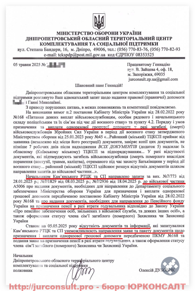Ось наприклад відповідь на наш запит після того як районний ТЦК завірив клієнтку що документи вже давно передані на область і саме обласний ТЦК затягує обробку документів: