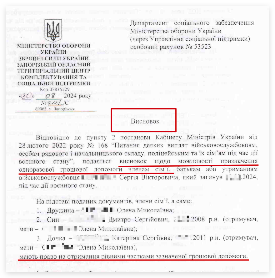 Інколи рідним загиблого військового виплачують лише частину ОГД, заморожуючи іншу – мотивуючи це тим що є інші “потенційні” отримувачі Одноразової грошової допомоги.