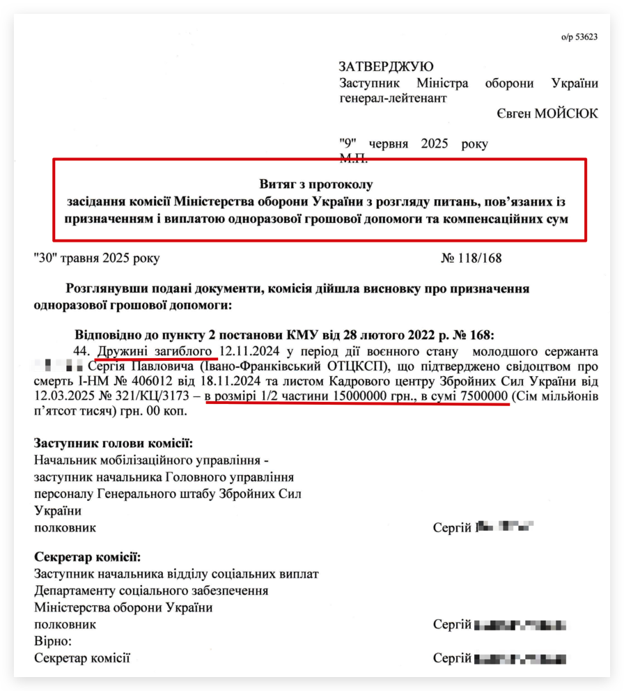 З вересня 2025 року щомісячні виплати зменшили вдвічі, тобто тепер рідні отримують 150 000 грн. на місяць протягом 80-ти місяців.