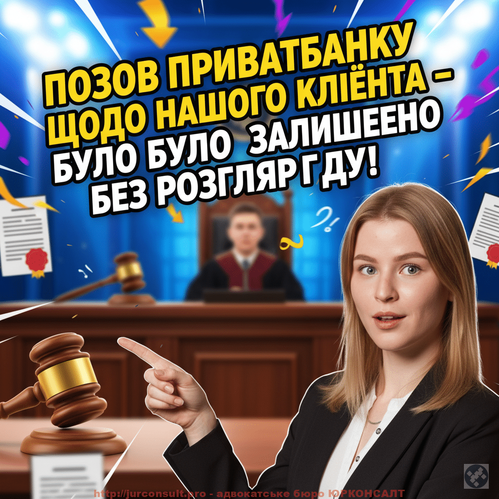 Позов Приватбанку до нашого клієнта було залишено без розгляду через неявку представника позивача на судові засідання. Суд підтвердив, що позивача належно повідомили про дати слухань, проте жодних доказів від нього не було надано у встановлені строки.