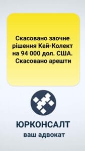 Скасовано арешти 🔹 Адвокатське бюро «ЮРКОНСАЛТ» повідомляє, що у справі проти товариства з обмеженою відповідальністю «Кей-Колект» було скасовано заочне рішення суду на 94 000 доларів США та арешти.