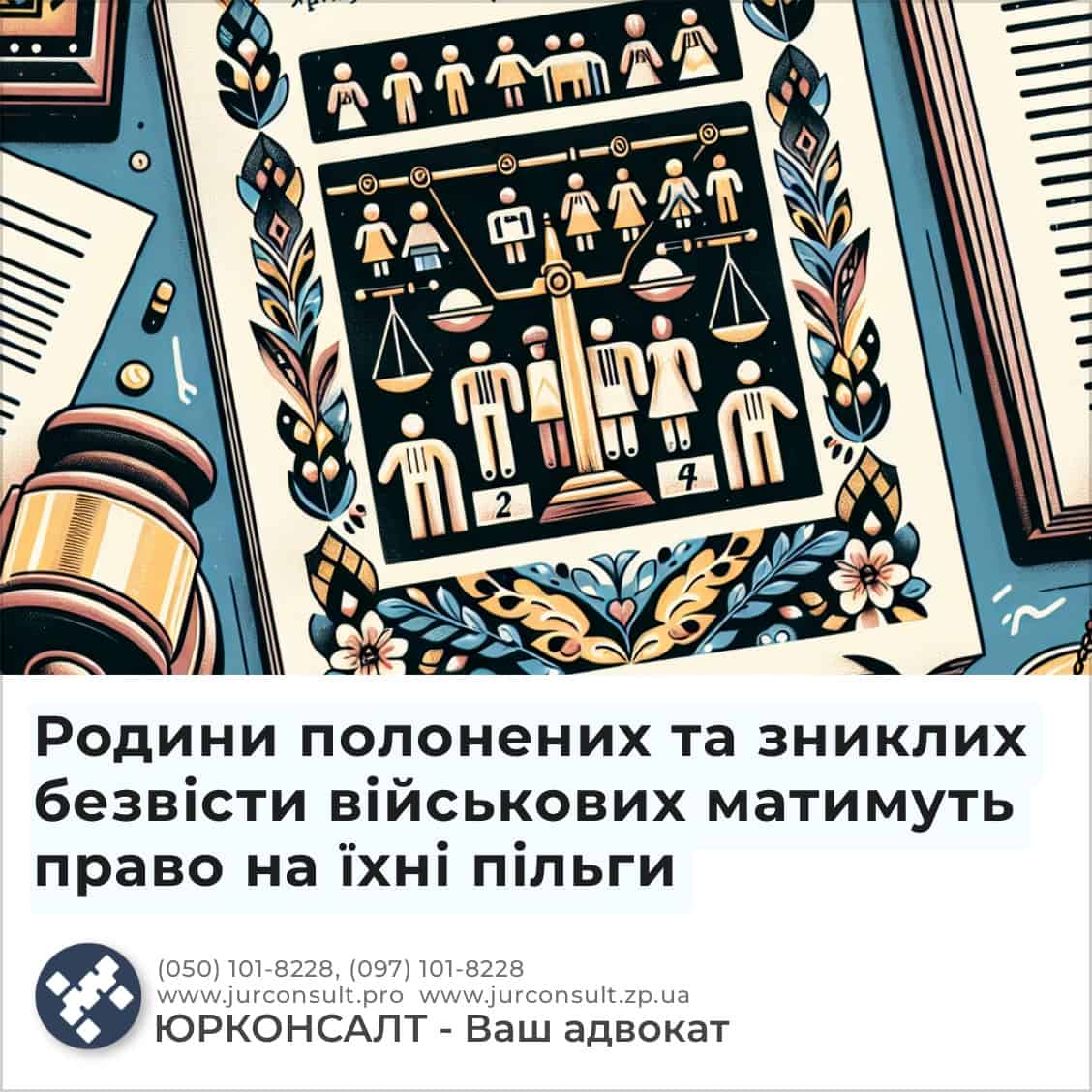 🧑⚖️ Надано можливість членам сім’ї, а саме чоловіку, дружині, непрацездатним батькам, дітям до 18 років, неодруженим повнолітнім дітям з інвалідністю з дитинства I та II групи або особам з інвалідністю I групи, а також особам, які перебувають під опікою або піклуванням громадянина, користуватися їхніми пільгами до моменту звільнення ветерана з полону або визнання його безвісно відсутнім чи померлим у судовому порядку.