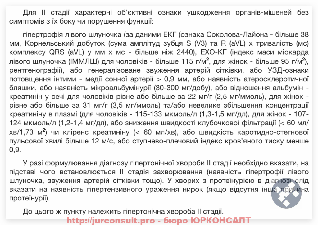 - Стадия II — уже есть объективные признаки повреждения (гипертрофия левого желудочка, изменения в дне, изменения в почках и т.д.), но без выраженной потери функции.