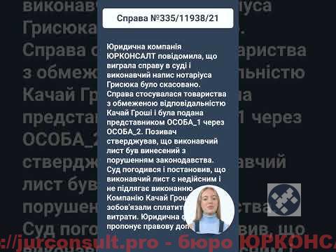 Юридична компанія ЮРКОНСАЛТ здобула чергову перемогу в суді, скасувавши виконавчий напис нотаріуса, що був виданий на користь товариства «Качай гроші». Справу вела адвокатка Чубареєва, яка успішно довела, що напис був оформлений з порушеннями чинного законодавства.