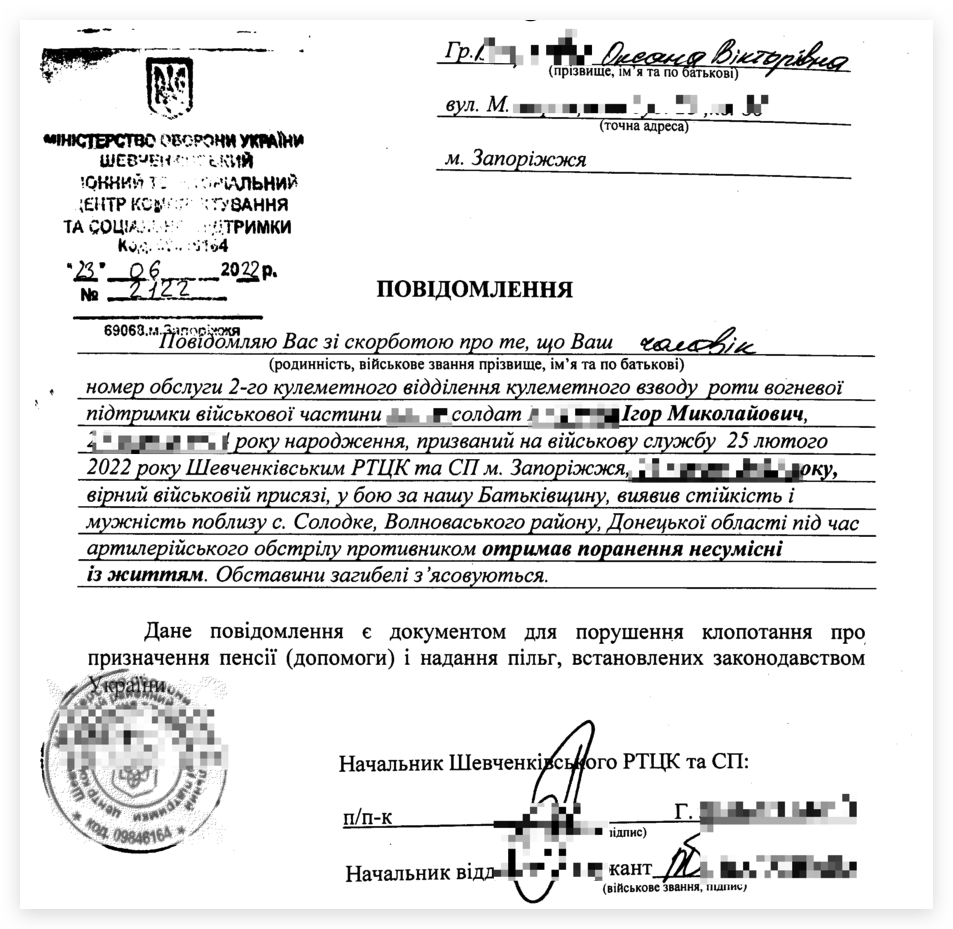 Офіційно родину інформує не командир особисто, а представник територіального центру комплектування та соціальної підтримки (ТЦК та СП), де військовий перебував на обліку.