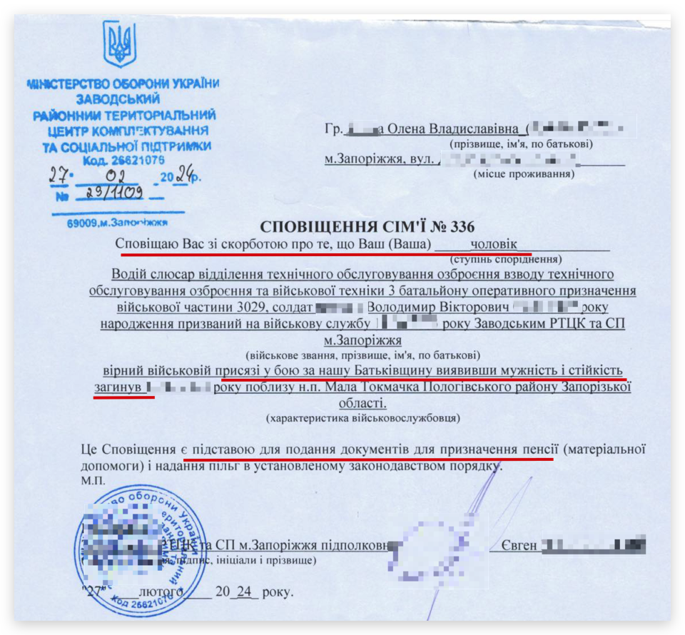 Першим кроком є офіційне сповіщення про смерть військовослужбовця, яке підтверджує сам факт загибелі.