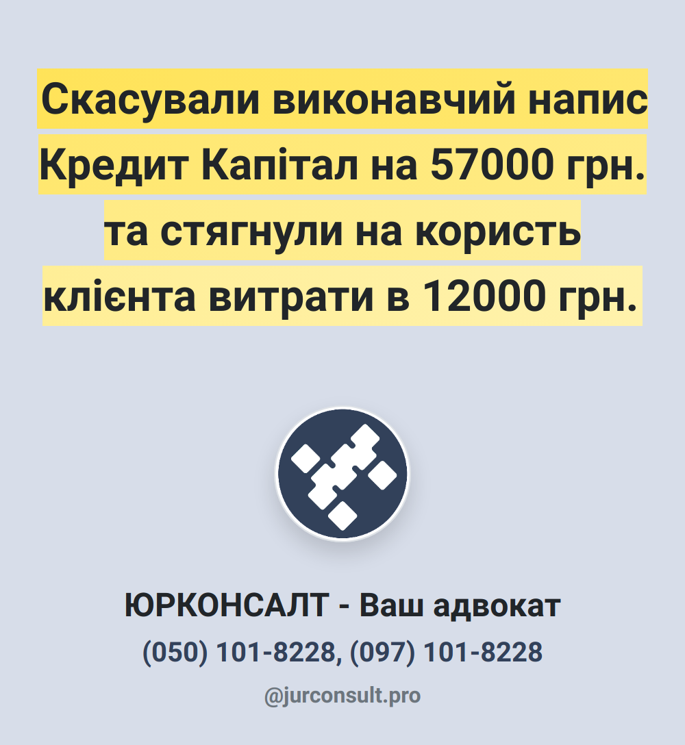 Адвокатське бюро "ЮРКОНСАЛТ" знову досягло успіху в судовому процесі. Наш клієнт, переміг у справі проти Товариства з обмеженою відповідальністю "Фінансова компанія "Кредит-капітал"". Рішення суду скасувало виконавчий напис, що зобов’язував клієнта сплатити суму в розмірі 57 000 грн.