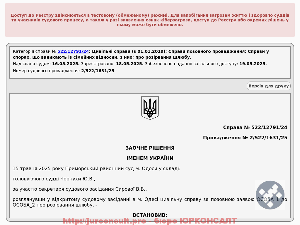 Розірвали шлюб без участі клієнта