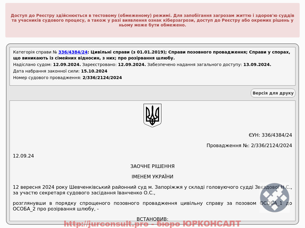 Розірвали шлюб без участі клієнта