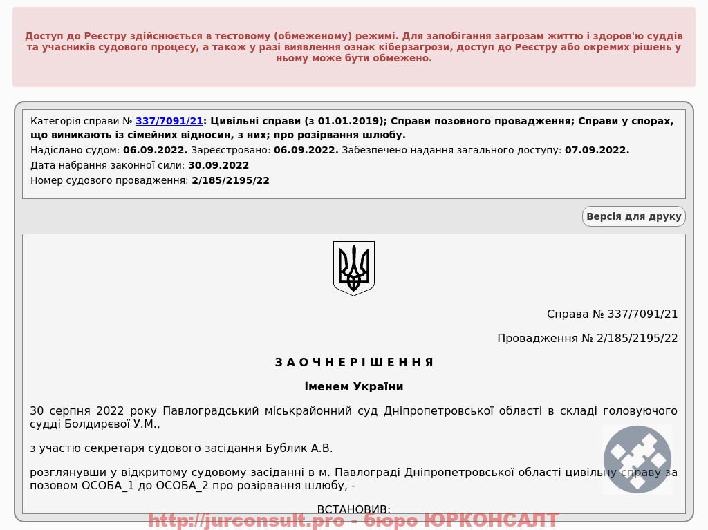 Суд задовольнив позов клієнта і розірвав шлюб, зареєстрований 15.08.2020, без участі обох сторін.