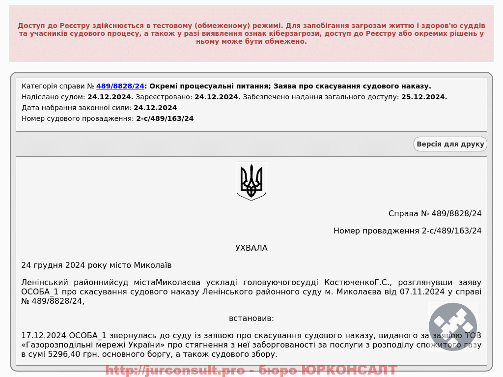Скасували судовий наказ про стягнення боргу ТОВ «Газорозподільні мережі України» на 5 тис. грн з клієнта.