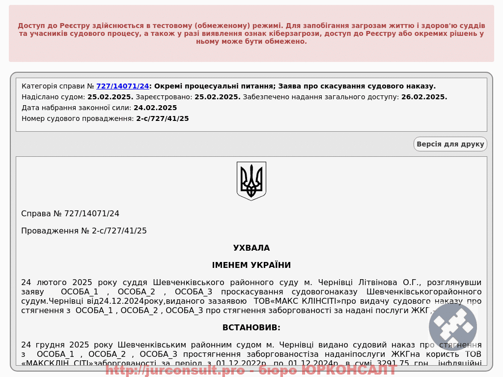 Скасували судовий наказ ТОВ «МАКС КЛІНСІТІ» про стягнення боргу за ЖКГ. Захистили клієнтів від стягнення понад 3 тисяч грн!