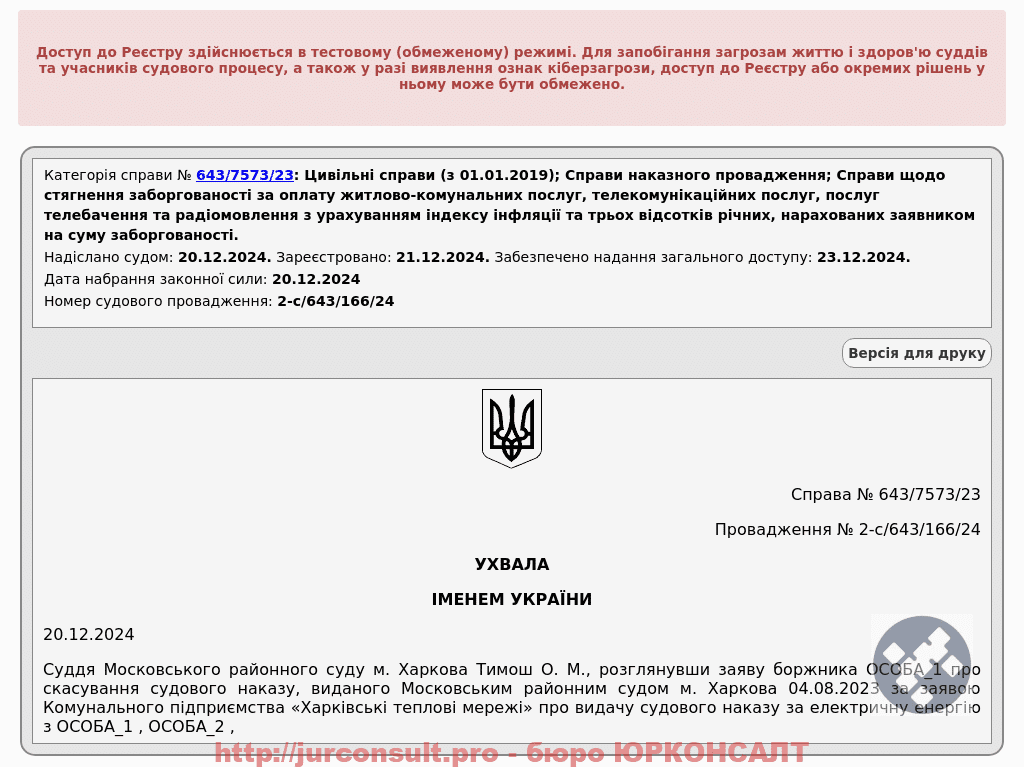 Скасували судовий наказ на 17 тис. грн, виданий на користь КП «Харківські теплові мережі». Захистили клієнта від стягнення боргу та виконавчого провадження!