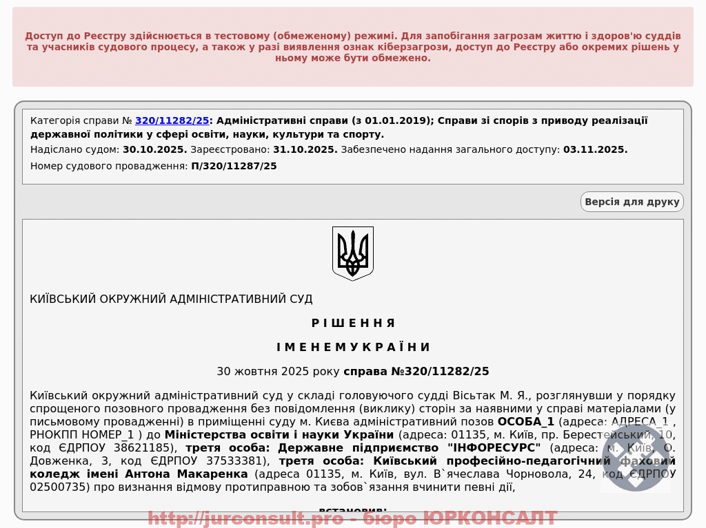 Домоглися визнання відмови МОН незаконною та зобов'язали змінити дані в ЄДЕБО. Захистили право клієнта на безперервну освіту для отримання відстрочки від призову!