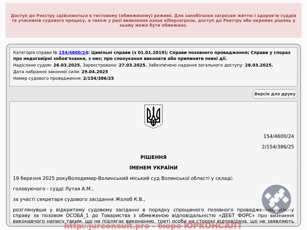 Скасували виконавчий напис на 29 тис. грн від ДЕБТ ФОРС. Захистили клієнта від стягнення боргу та арешту рахунків!