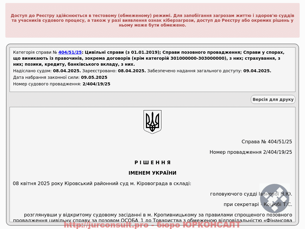 Домоглися скасування виконавчого напису по кредиту на 33 тис. грн від ТОВ «ФК «Еліт Фінанс». Захистили клієнта від незаконного стягнення боргу та арешту рахунків.