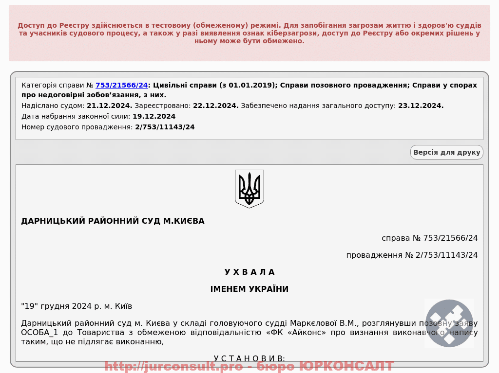 Клієнт звернувся для скасування виконавчого напису кредитора ФК "Айконс".