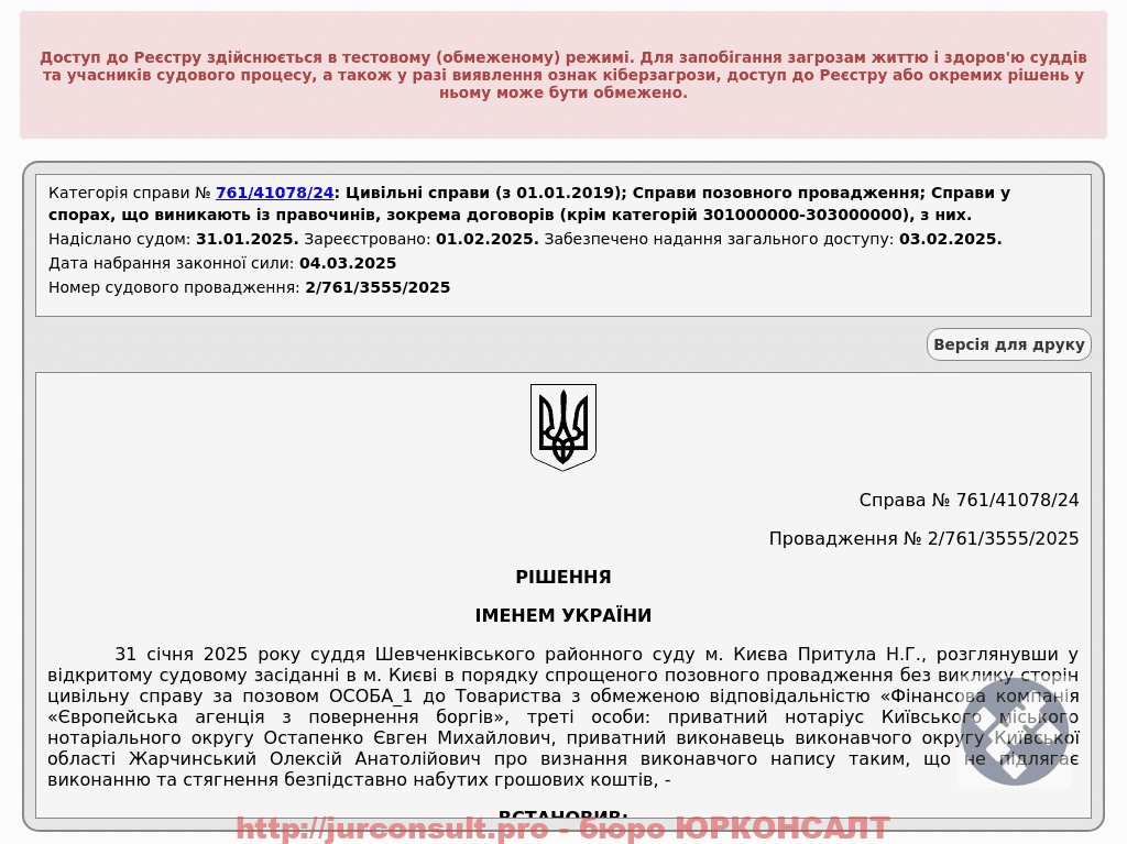 Виконавчий напис нотаріуса дозволив кредитору «Європейська агенція з повернення боргів» стягнути примусово 13 000 грн з клієнта за кредитним договором, укладеним з Ідея Банком. Клієнт звернувся оскаржити такі дії та повернути незаконно стягнуто кошти.