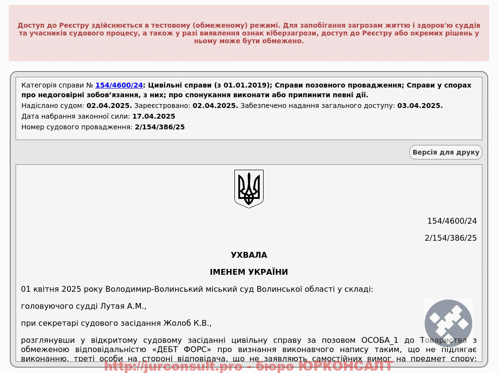 Клієнт звернувся, щоб оскаржити виконавчий напис нотаріуса щодо кредитної заборгованості перед ТОВ «ДЕБТ ФОРС».