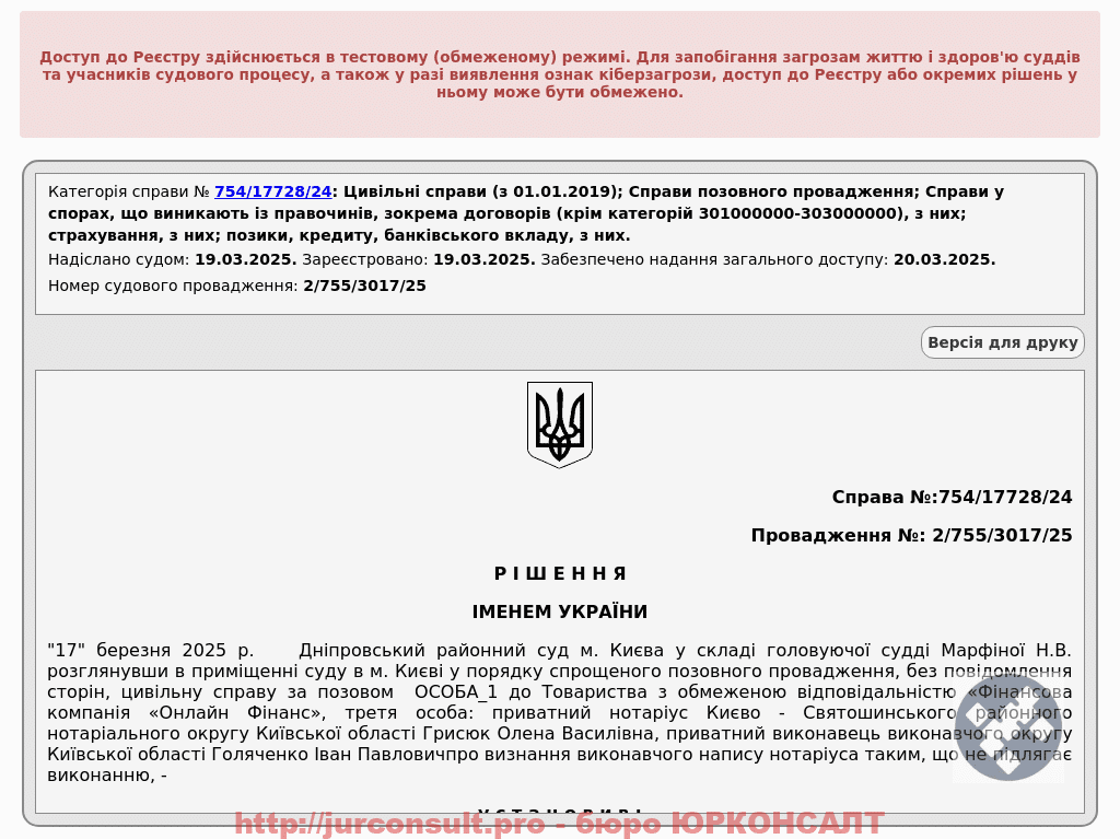 Скасували виконавчий напис ФК «Онлайн Фінанс» на 47 тисяч гривень! Повернули клієнту спокій та відшкодували витрати на адвоката.