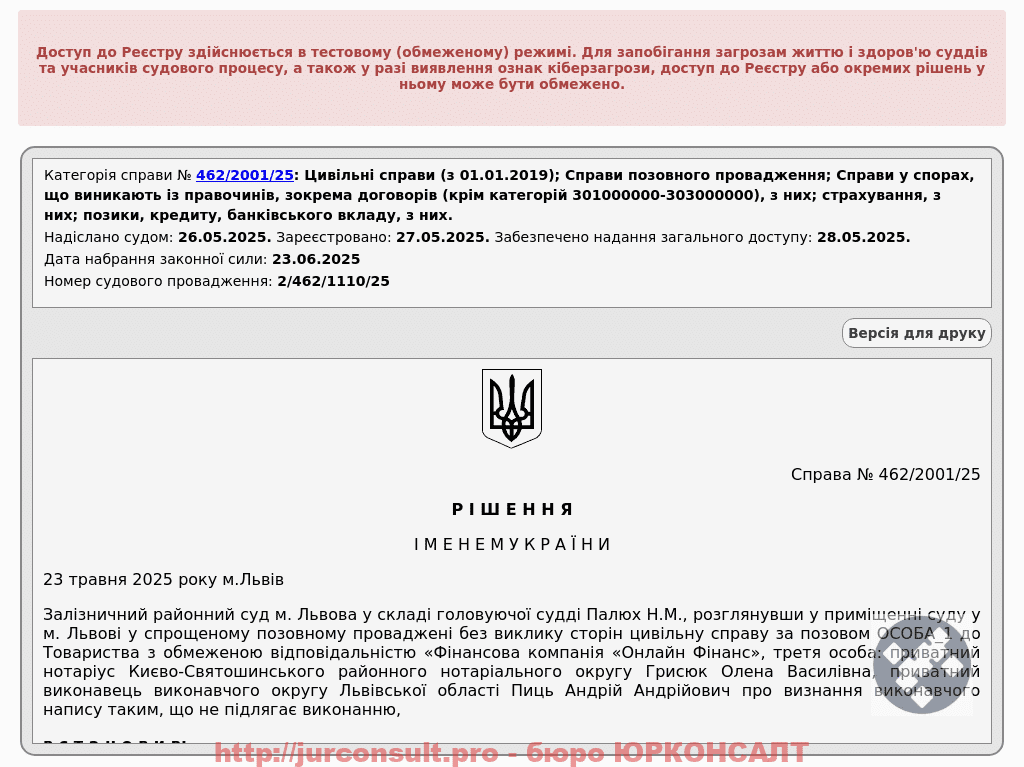 Суд визнав виконавчий напис, виданий на користь 'Онлайн Фінанс', таким, що не підлягає виконанню, і стягнув судові витрати на користь клієнта.