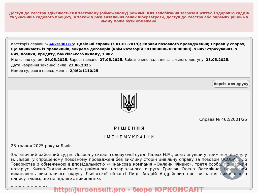 Суд визнав виконавчий напис, виданий на користь 'Онлайн Фінанс', таким, що не підлягає виконанню, і стягнув судові витрати на користь клієнта.