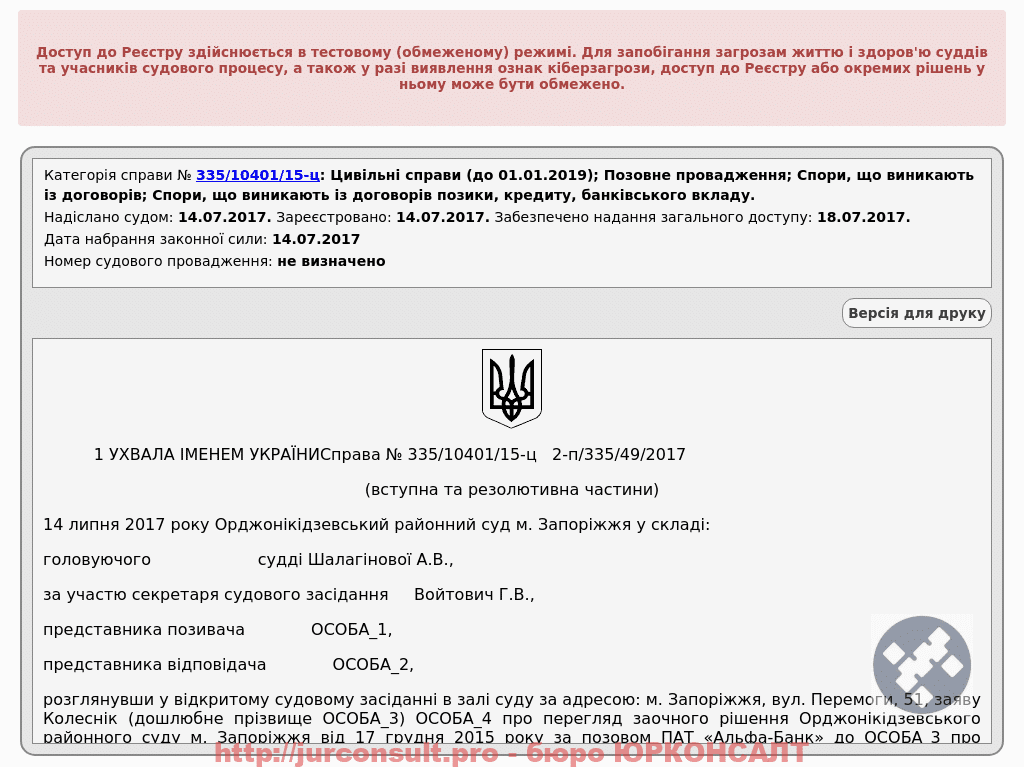 Добилися скасування заочного рішення по кредиту від ПАТ «Альфа-Банк». Захистили клієнта від примусового стягнення боргу за кредитом!