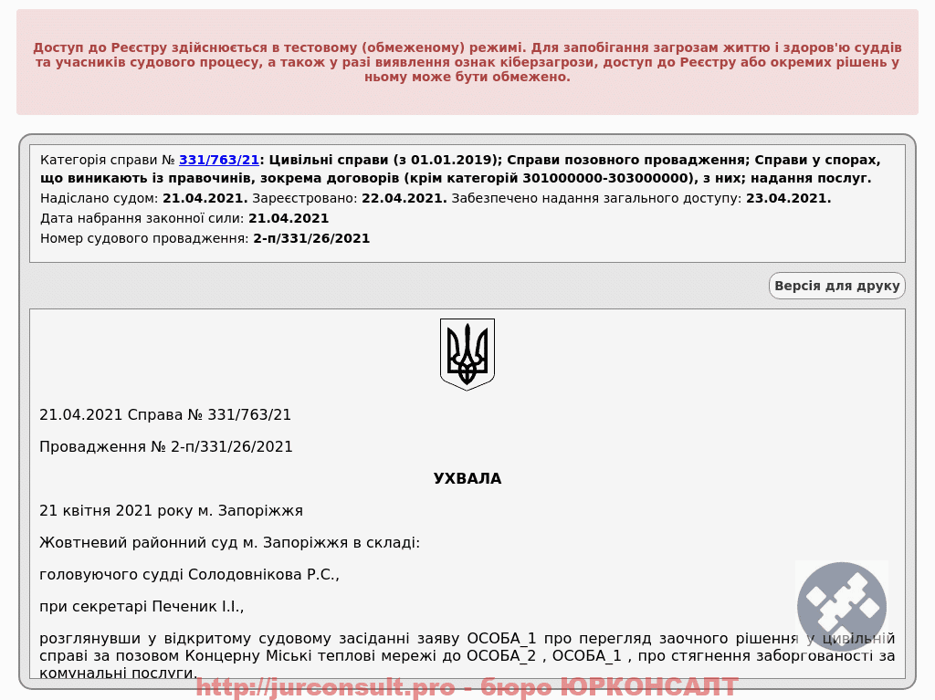 Клієнт дізнався про наявність заочного рішення по стягненню боргу за комунальні послуги без його участі.