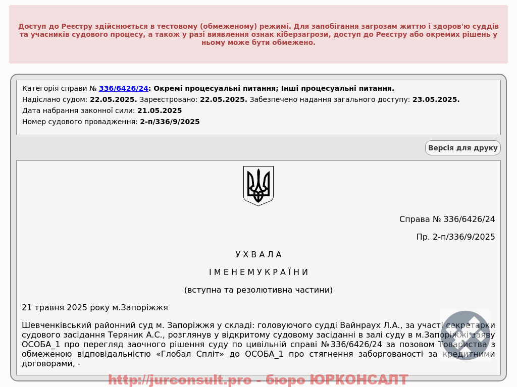Клієнт звернувся через заочне рішення суду про стягнення кредитної заборгованості на користь ТОВ "Глобал Спліт" без участі клієнта.