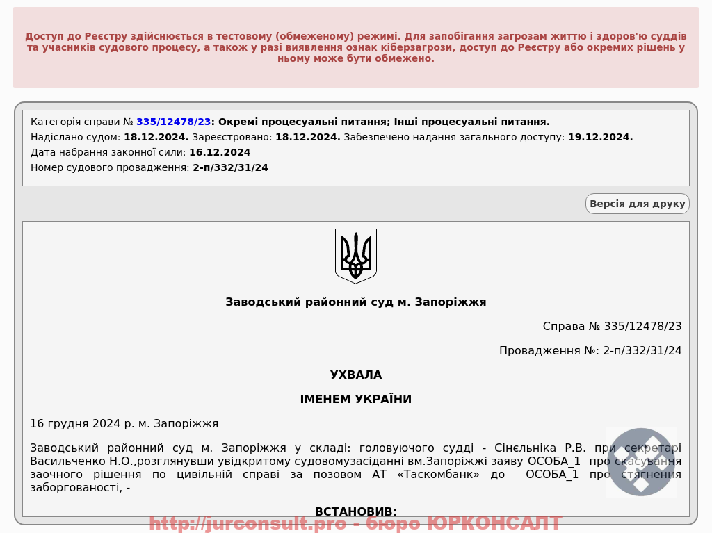 Оскаржили заочне рішення про борг перед Таскомбанком і досягли його скасування! Тепер клієнт отримав шанс на справедливий розгляд справи і захист від незаконного стягнення.