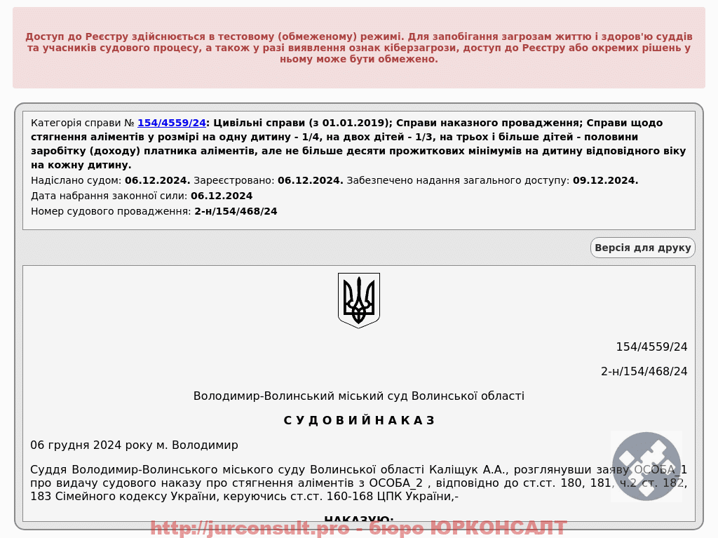 Добилися судового наказу на стягнення аліментів у розмірі 1/4 заробітку другого з батьків. Забезпечили захист прав клієнта та дитини на регулярне отримання фінансової підтримки!