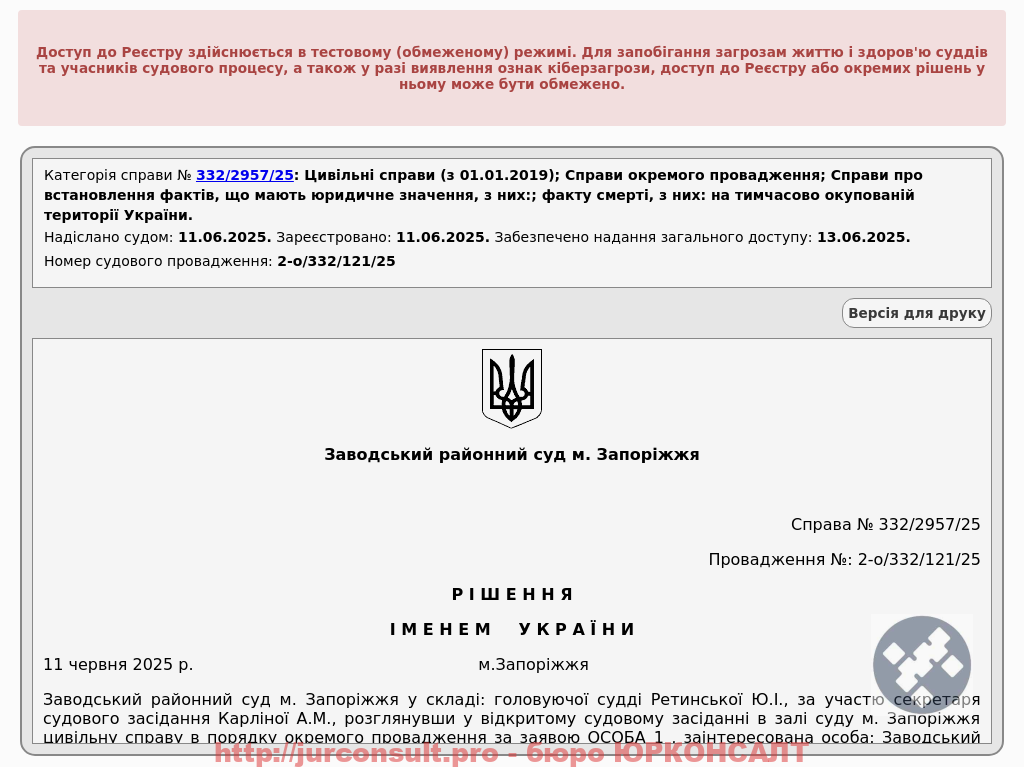 Встановили факт смерті на окупованій територіїВід Юрконсалт / 13.06.2025 Категорія: Встановлення фактів