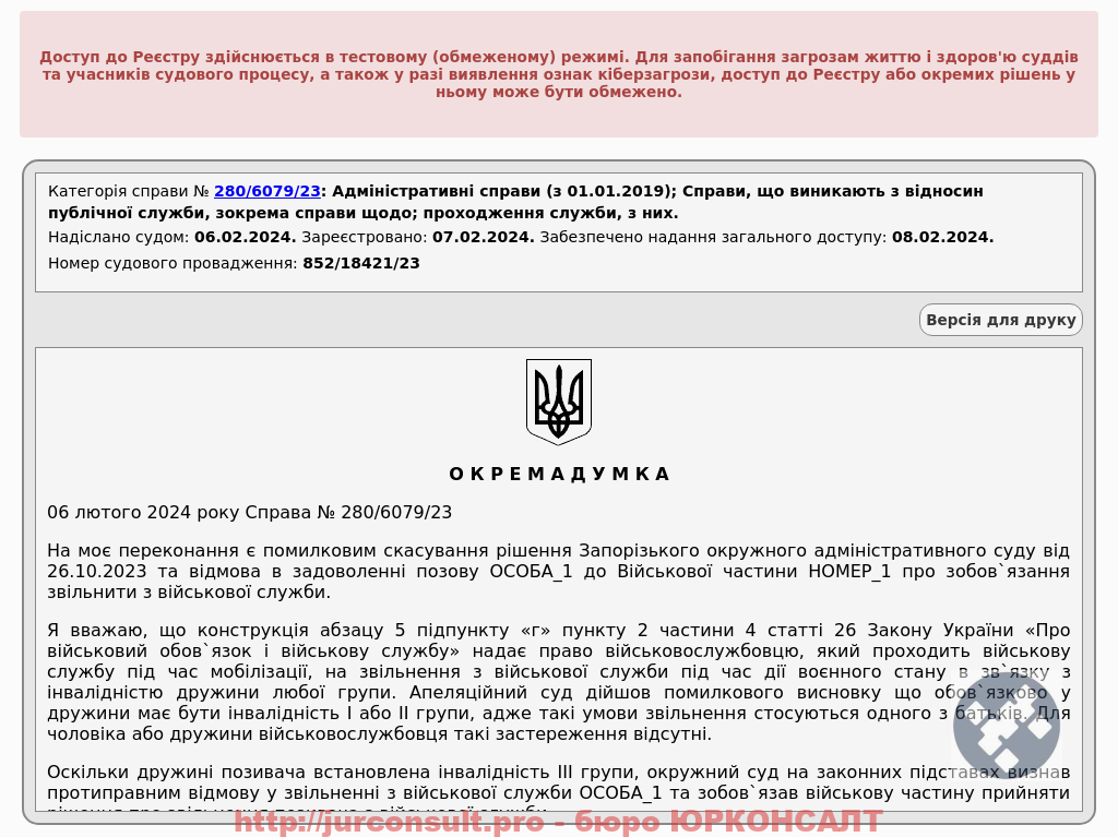Подали позов щодо звільнення клієнта з військової служби через інвалідність дружини. Захищали права військовослужбовця на звільнення за законом.
