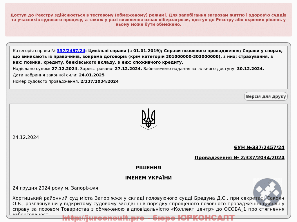 Клієнту загрожувало стягнення кредитної заборгованості у понад 54 000 грн за позовом ТОВ «Коллект Центр».