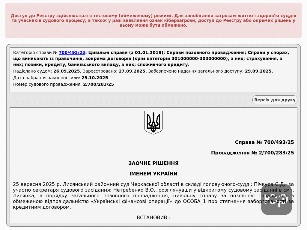 Клієнту пред'явили кредитний позов на 175 000 грн від фінансової компанії.