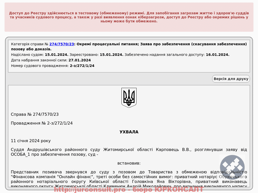 Суд зупинив примусове стягнення коштів на користь ТОВ «ФК Онлайн фінанс» по виконавчому напису на 14 600 грн.