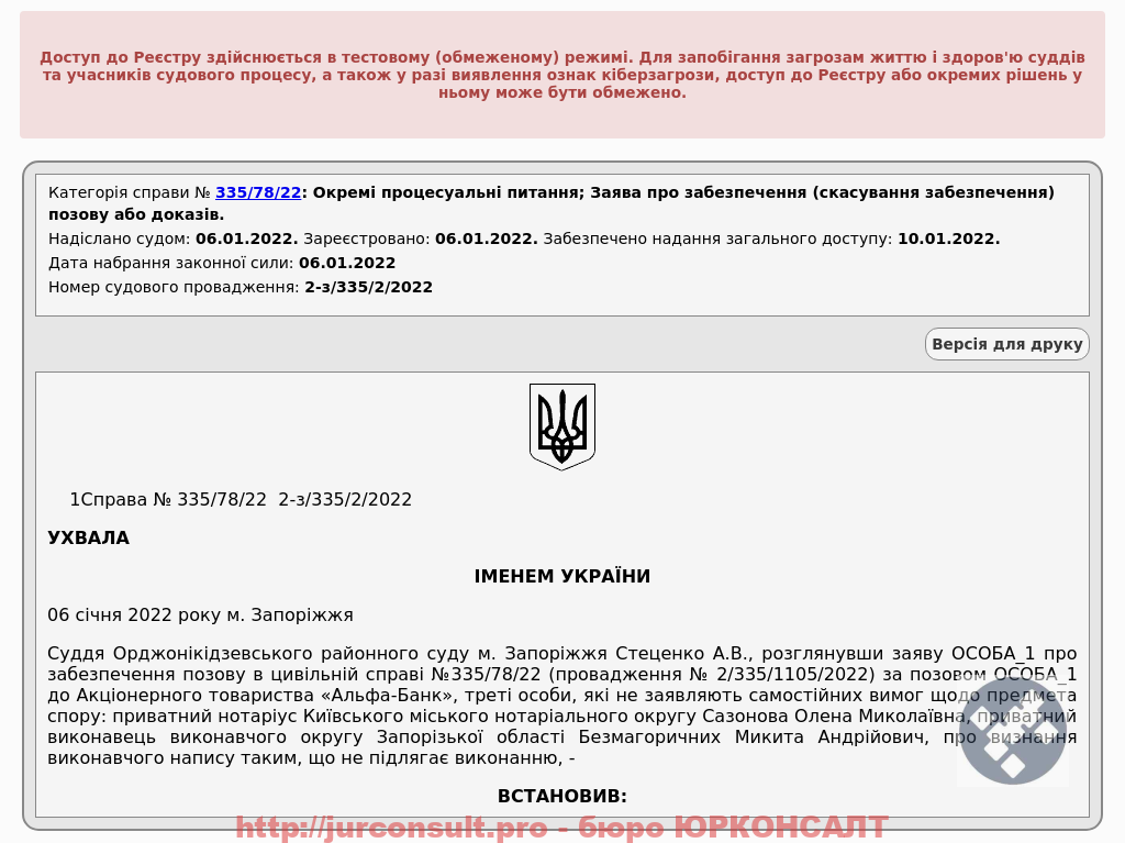 Забезпечили зупинення стягнення боргу за кредитом від Альфа-Банк на 41 000 грн. Захистили кошти клієнта до вирішення справи!
