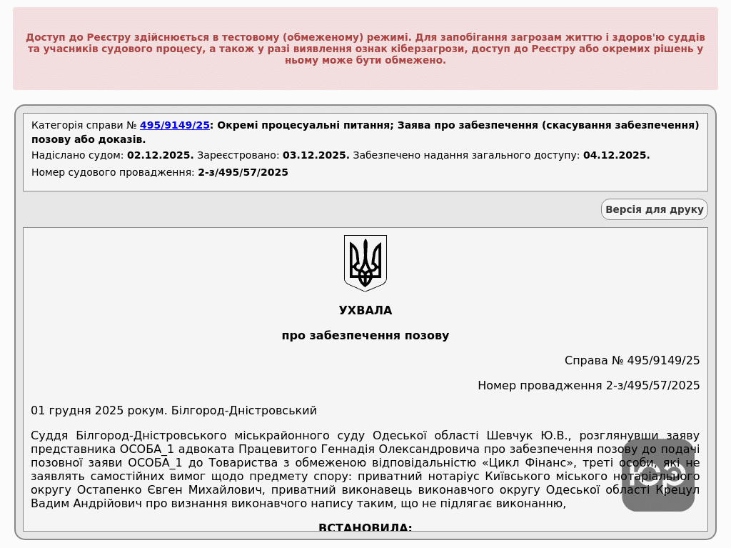 Суд зупинив стягнення за виконавчим написом нотаріуса Цикл Фінанс і заблокував списання коштів з рахунків клієнта.