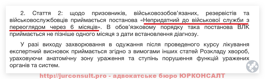 Згідно з поясненнями, щодо призовників, військовозобов’язаних, резервістів та військовослужбовців приймається постанова «Непридатний до військової служби з переоглядом через 6 місяців».